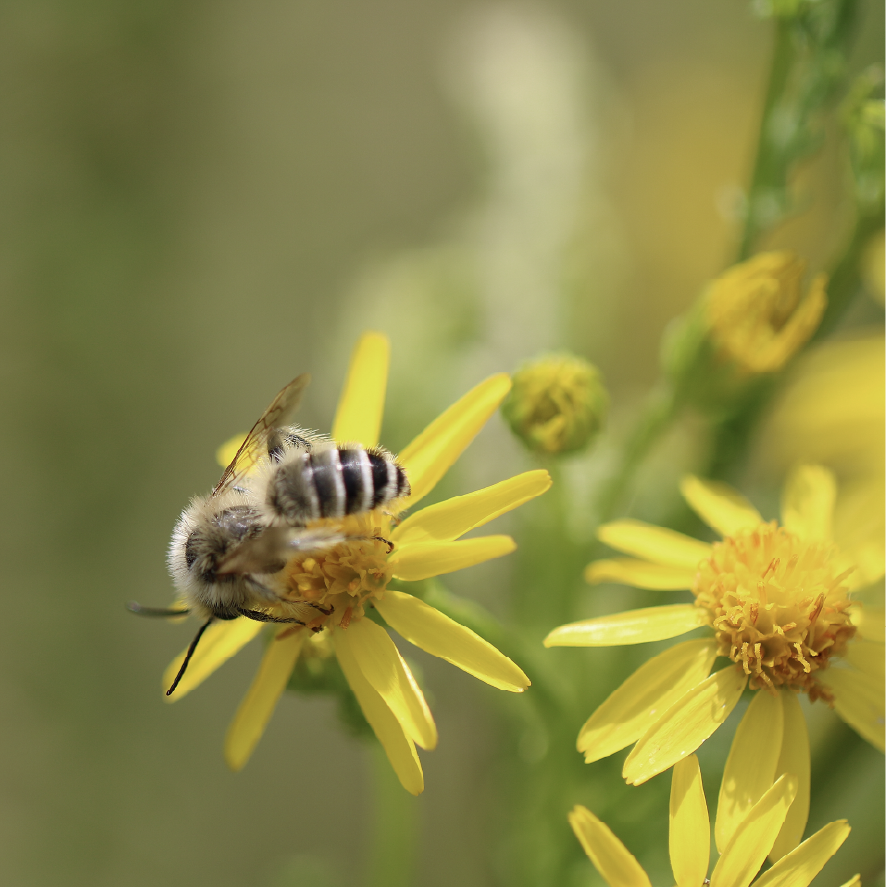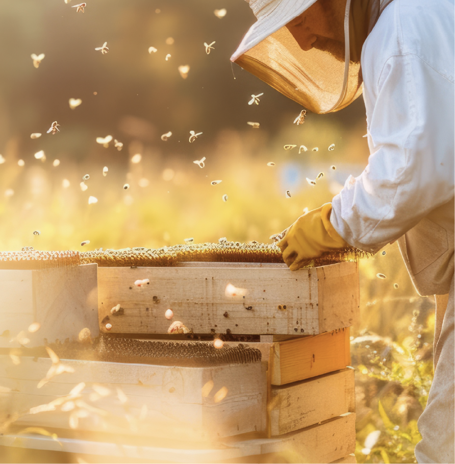 <なぜ養蜂なのか?> ミツバチの役目は、天然の美味しいハチミツを集めることだけではありません。果樹や野菜を受粉させるための媒体にもなってくれます。たとえば、リンゴの樹が花を咲かせる時期に、巣箱のミツバチを花に向かって飛ばします。するとミツバチは一生懸命、花から花へと飛び回り、ハチミツを集めます。その過程で、ミツバチの体に付着した花粉が、おしべからめしべへと受粉されるのです
